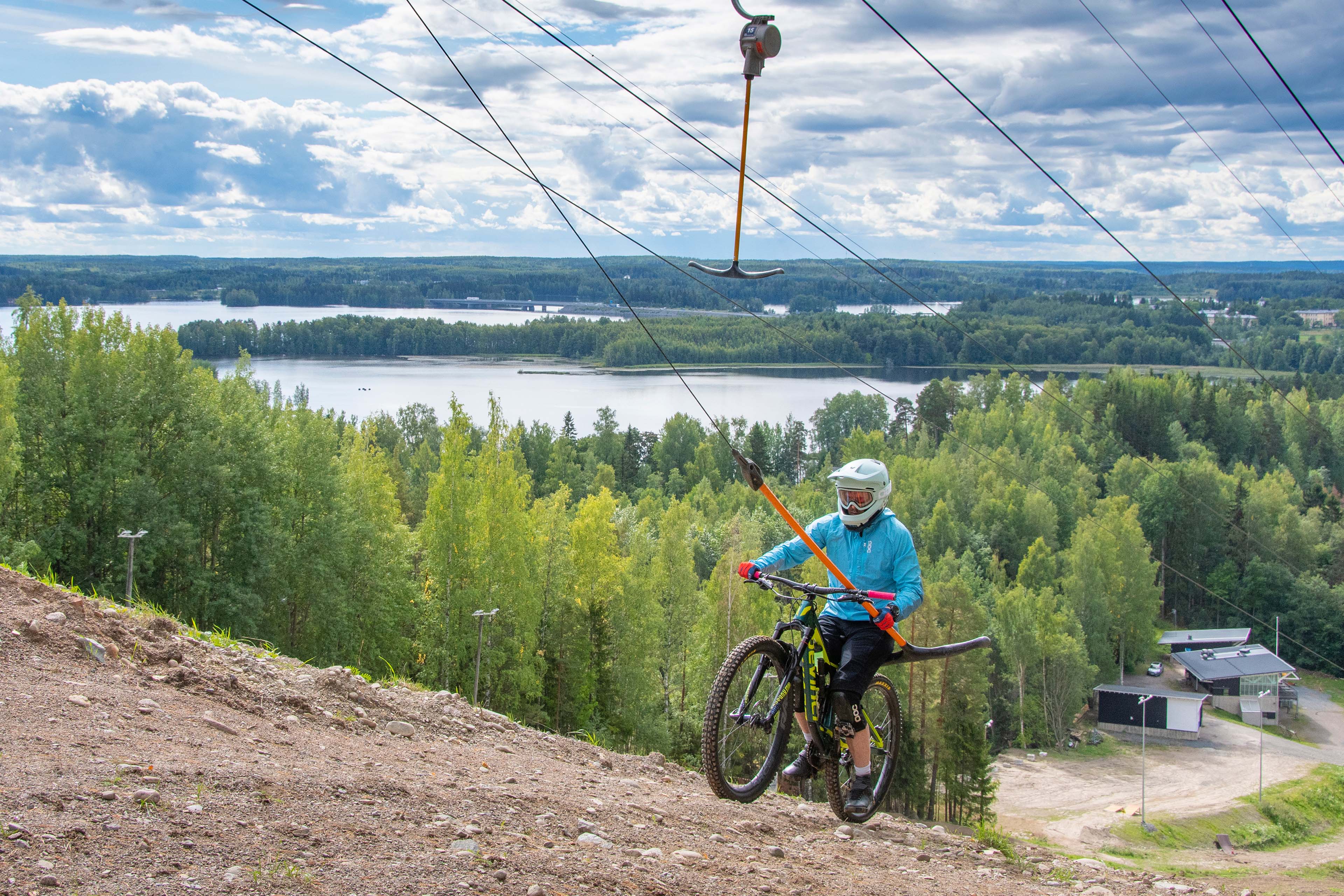 Mustavuoren Bike Park Tampereella: yhdeksän eritasoista reittiä aloittelijoista kokeneisiin alamäkikuljettajiin. Hissipyöräily sujuu vaivattomasti kahden hissin voimin.