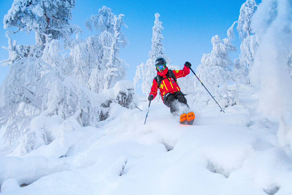 At Pyhä, the ski patrol also operates beyond marked slopes. The skier in the photo, Ville Väkeväinen, is part of the new Pyhä Avalanche Safety Center team.