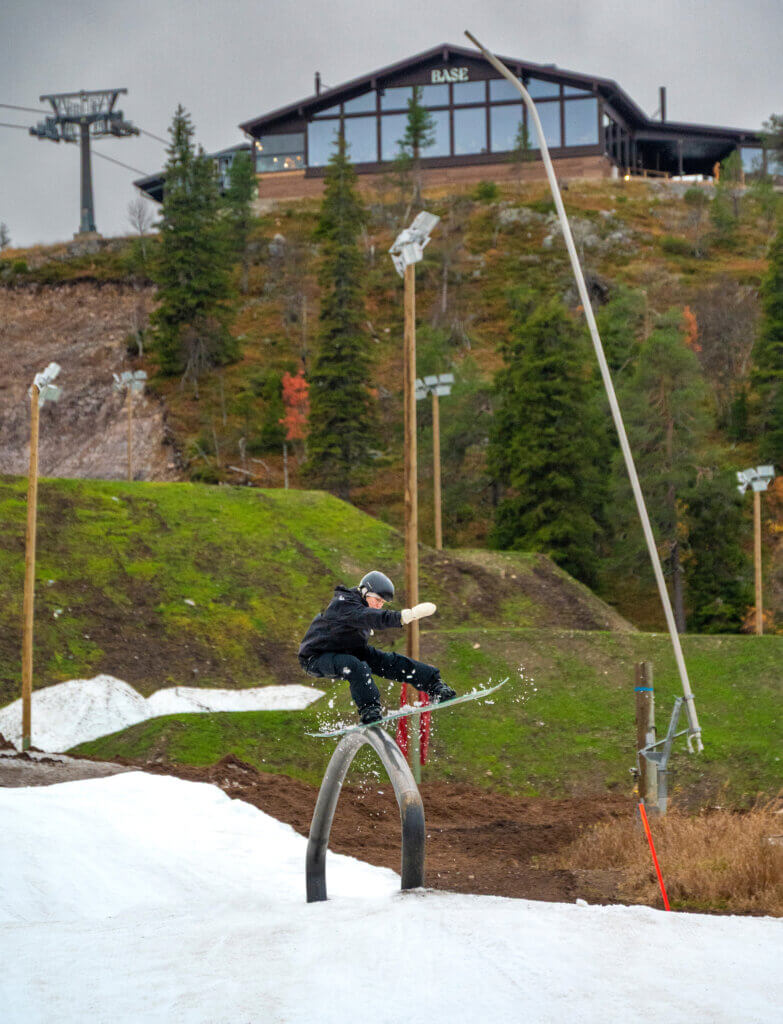 Maajoukkuelautailija Eveliina Taka Rukan parkissa lokakuussa. Kuva kiteyttää Rukan kolme kulmakiveä: säilölumen, yhteistyön maajoukkueiden kanssa sekä kehitystä symboloivan Base ravintola- ja saunakompleksin.